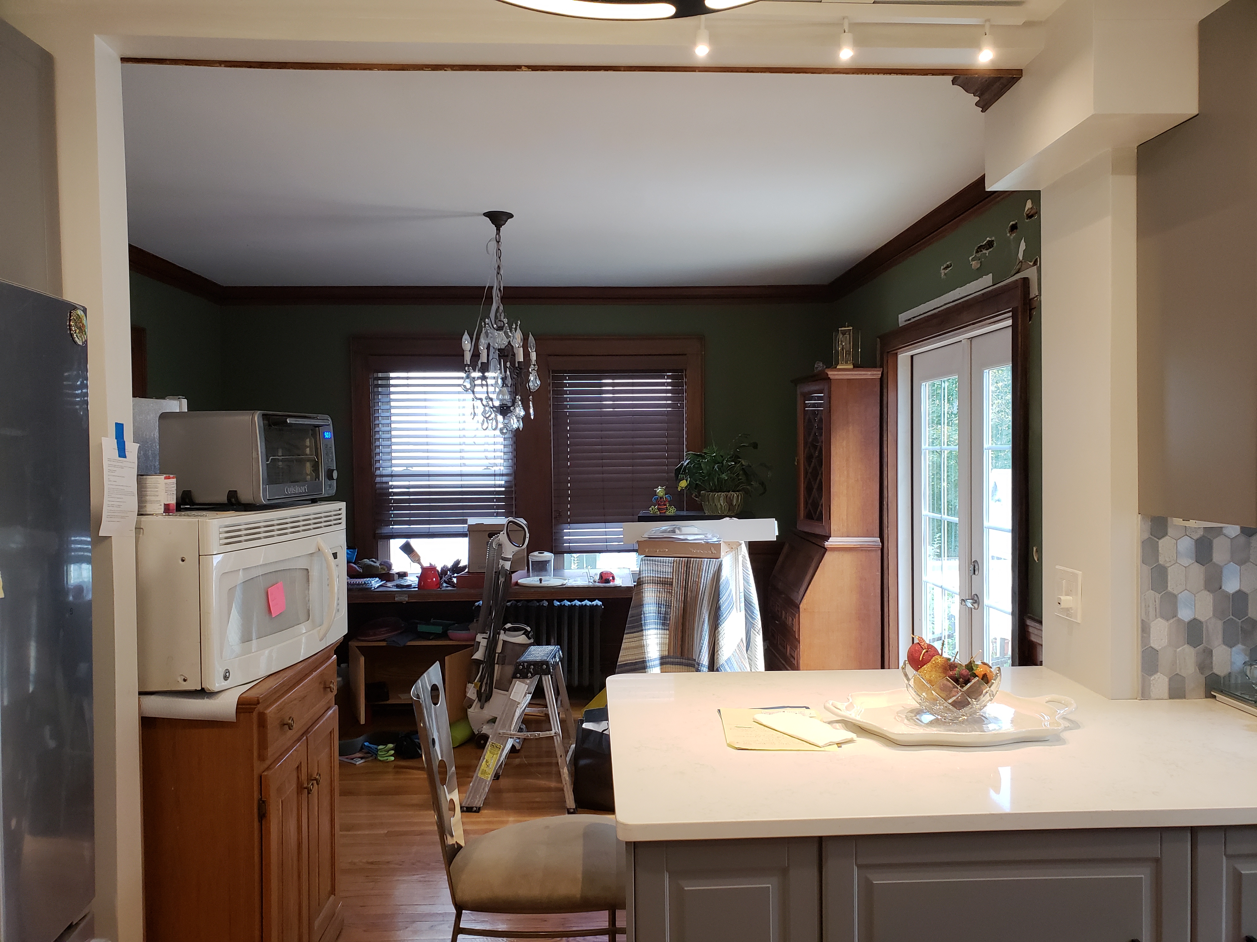 - Parsonage Kitchen – view into Dining Room, peninsula and cook wall
